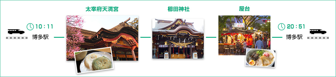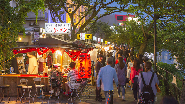 日帰り旅は「屋台」で締めくくり。おすすめ1品とドリンク1杯が付いてくるお得な「屋台きっぷ」もあるので安心して楽しめます。