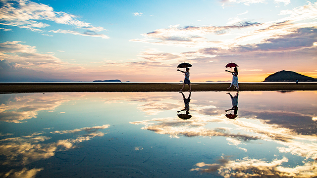 日本のウユニ塩湖とも呼ばれ、その美しい夕陽は「日本の夕陽百選」にも選ばれる。